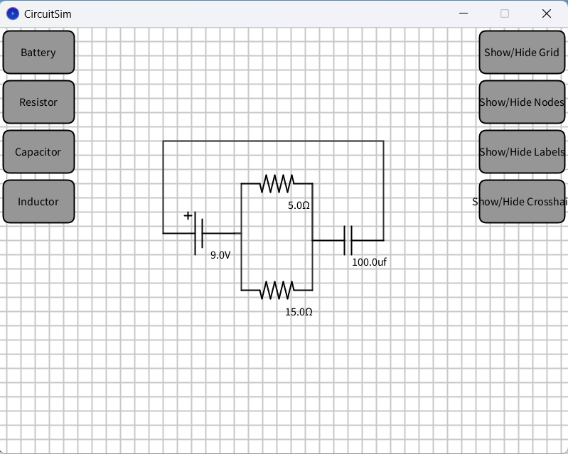 A Java program that is able to simulate passive components in a circuit, genertating graphs or time specific values of the voltage and current of each component.